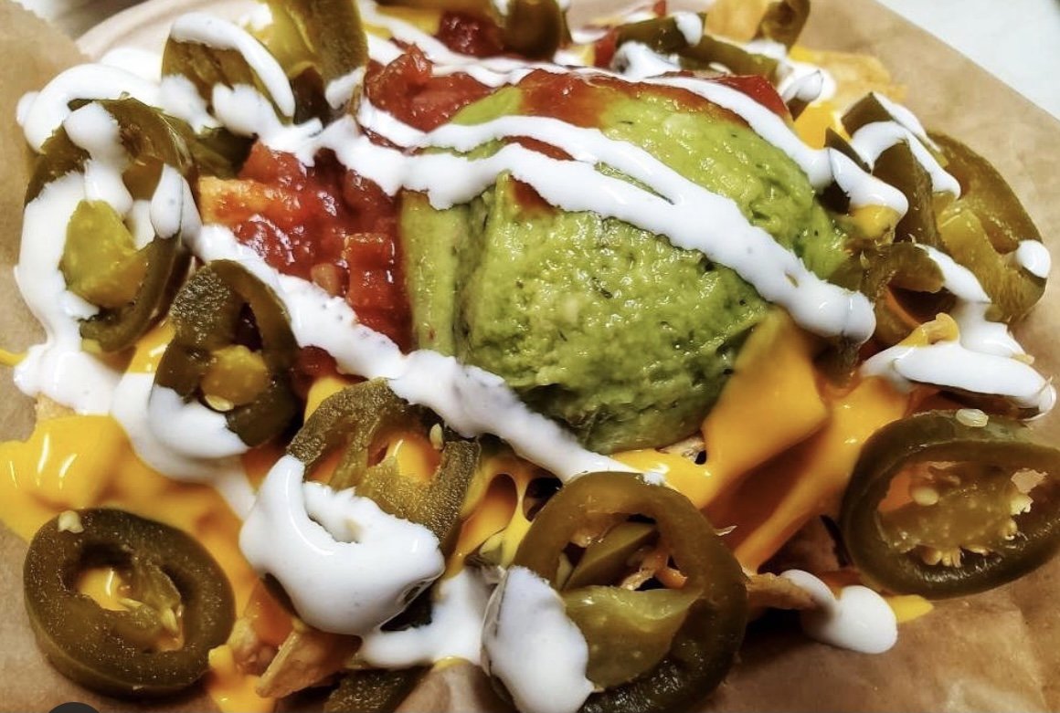 Our Ultimate nacho has both Corn tortilla chips & Nacho Cheese Doritos mixed with curly fries! Indulge in the array of toppings, including beef and bean chili, sour cream, crumbled bacon, jalapeños, cilantro, and of course, CHEESE!