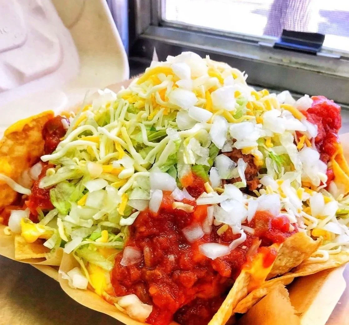 Another vegetarian option for the taco lovers! Corn tortilla chips, vegetarian refried beans, red salsa, diced white onion, shredded lettuce and 2 different types of cheese!
